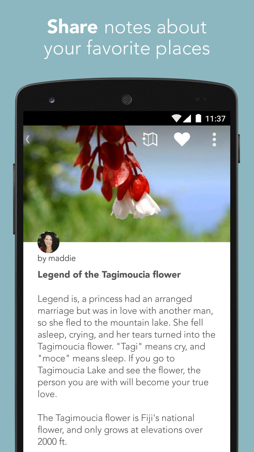 Laissez des notes sur les endroits que vous n'oublierez jamais et les endroits que vous souhaitez partager. C'est facile. Prenez une photo, partagez un endroit que vous aimez et ajoutez-le à la carte - puis partagez votre histoire avec le monde ou envoyez-la à un ami.